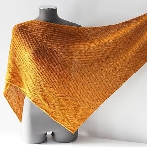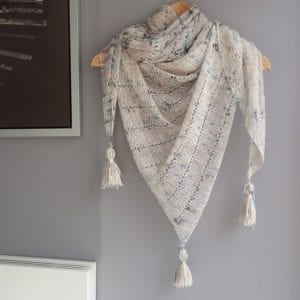 Canut est un châle tricoté latéralement et alternant point mousse et point brioche pour terminer en beauté avec une bordure en i-cord.